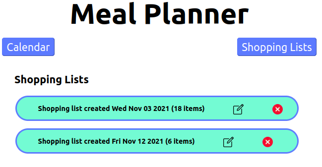When users have saved shopping lists, they can use the Shopping Lists button on the home page to view a list of saved shopping lists, delete shopping lists, and navigate back to the shopping list generator to edit existing lists. Just like the calendar component, the shopping lists list component uses SWR for data fetching.