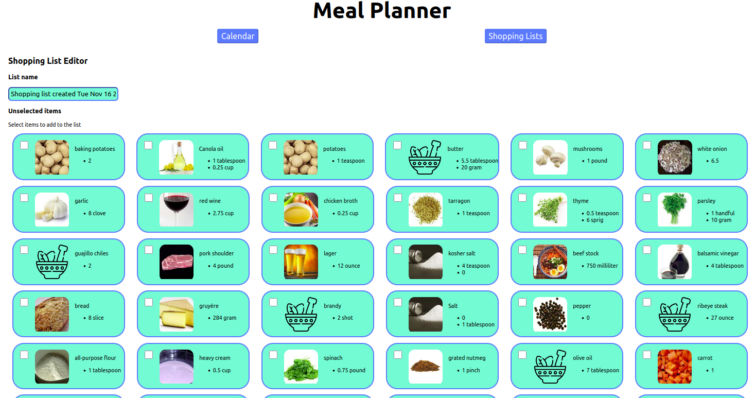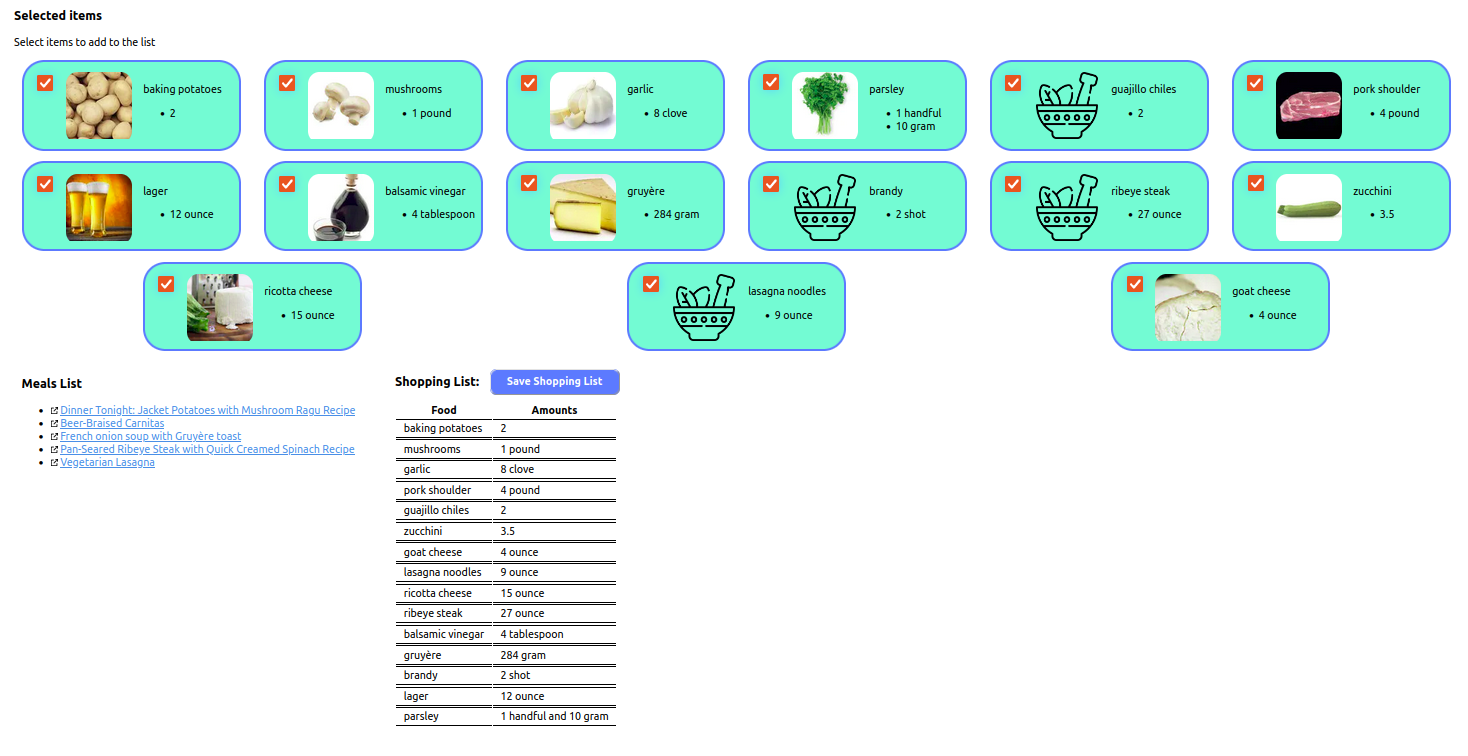 I added checkboxes on each calendar cell and a "generate shopping list" button beneath the calendar. When a user selects dates with recipes and clicks the button, the shopping list generator presents a list of all possible ingredients (as supplied by Edamam).
