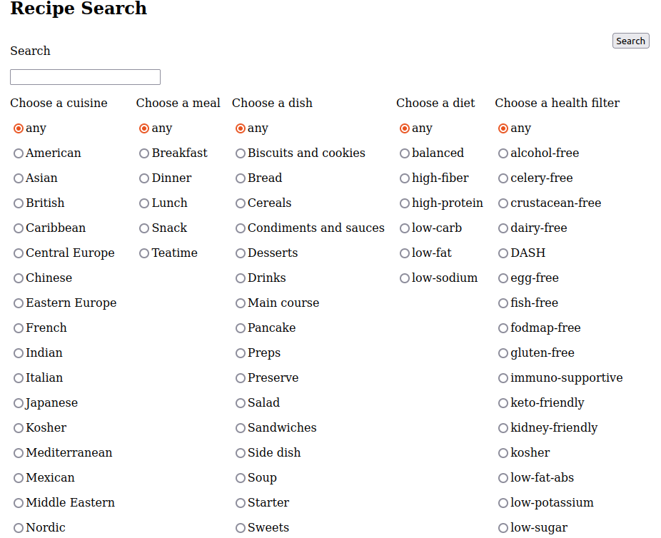 Edamam provides some decent recipe filtering options out of the box, so I put together a quick and dirty search form that implements most of their existing filters and a keyword search. Then I wired it up to another API on my Next.js app that was responsible for querying Edamam: