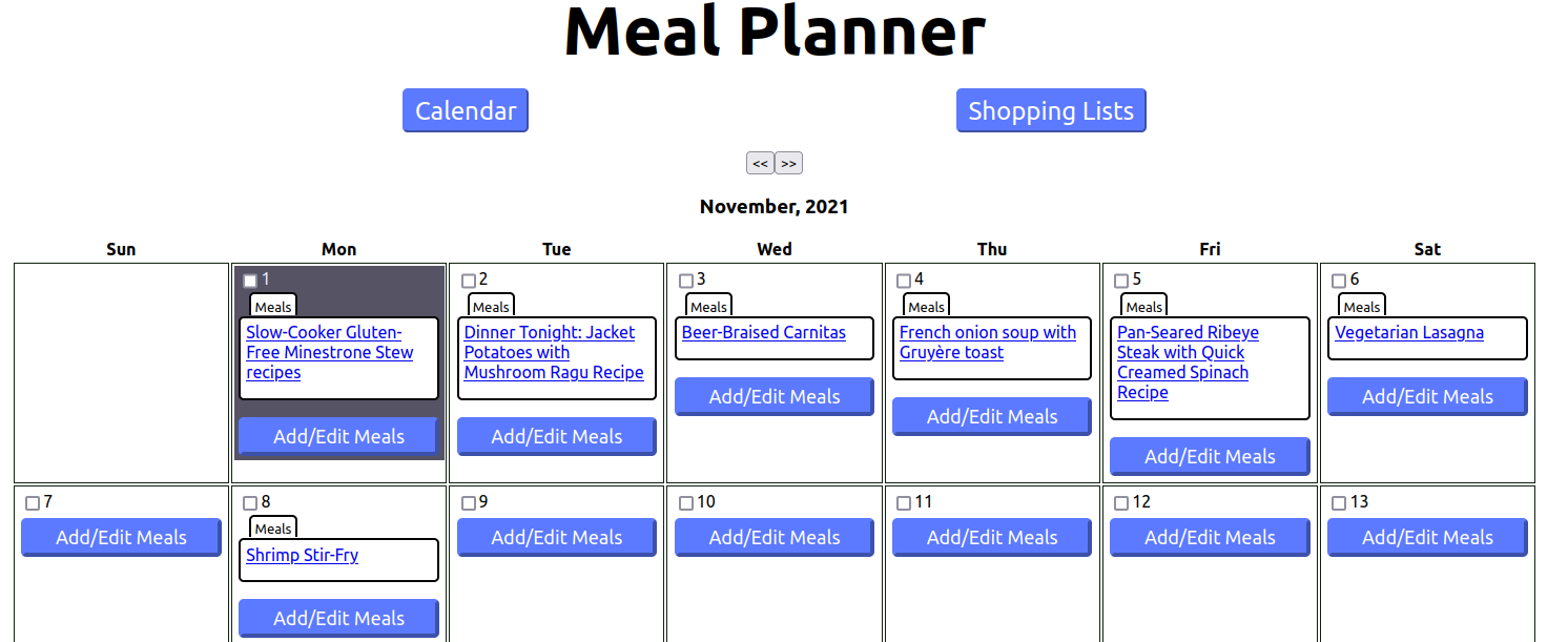 I needed to populate the calendar with currently selected meals, so I exposed an API on my Next.js app (which is incredibly simple to do with Next.js) and used it to query my DB. Originally, I bootstrapped the project with MongoDB's Next.js starter which fetches data using Next's getServerSideProps function. But, waiting for the server to respond with data before rendering the calendar wasn't quite the super-slick modern web app experience that I was trying to achieve, and relying on getServerSideProps means that the page must refresh or I need to call an API to refresh the data anyway, so I converted it to use SWR to allow the calendar to render while the data is still being fetched. You can see the resulting component here. In the end, it looked like this: