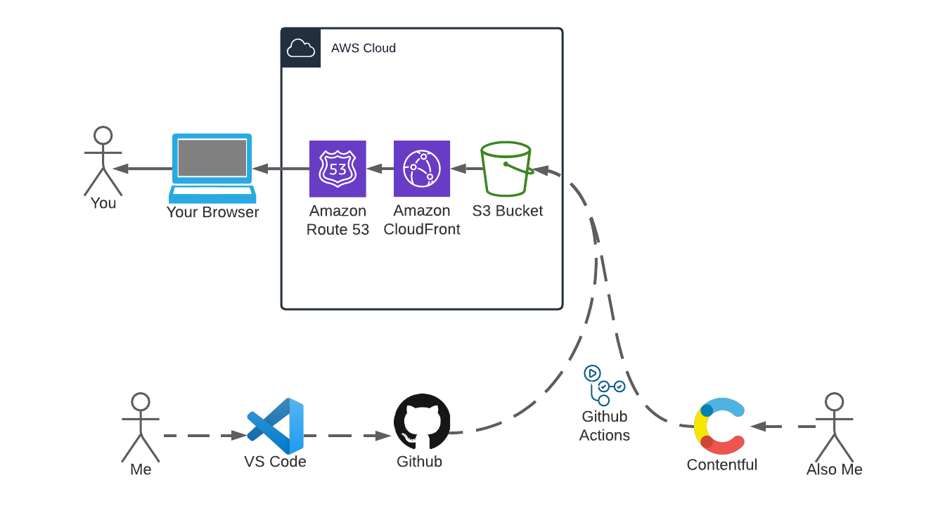I write code with VS Code. When I am ready to commit my changes, I push the updated code to Github where Github Actions execute my tests, build the static website using the gatsby-source-contentful plugin, and uploads the build artifacts to AWS S3. I use Amazon Route 53 to point my domain to an AWS CloudFront distribution which delivers this website to your browser which your eyeballs or screen reader are now reading. If you want to know more, the website code is available here: https://github.com/hatertron3000/patrickbuildscoolstuff-gatsby-site.